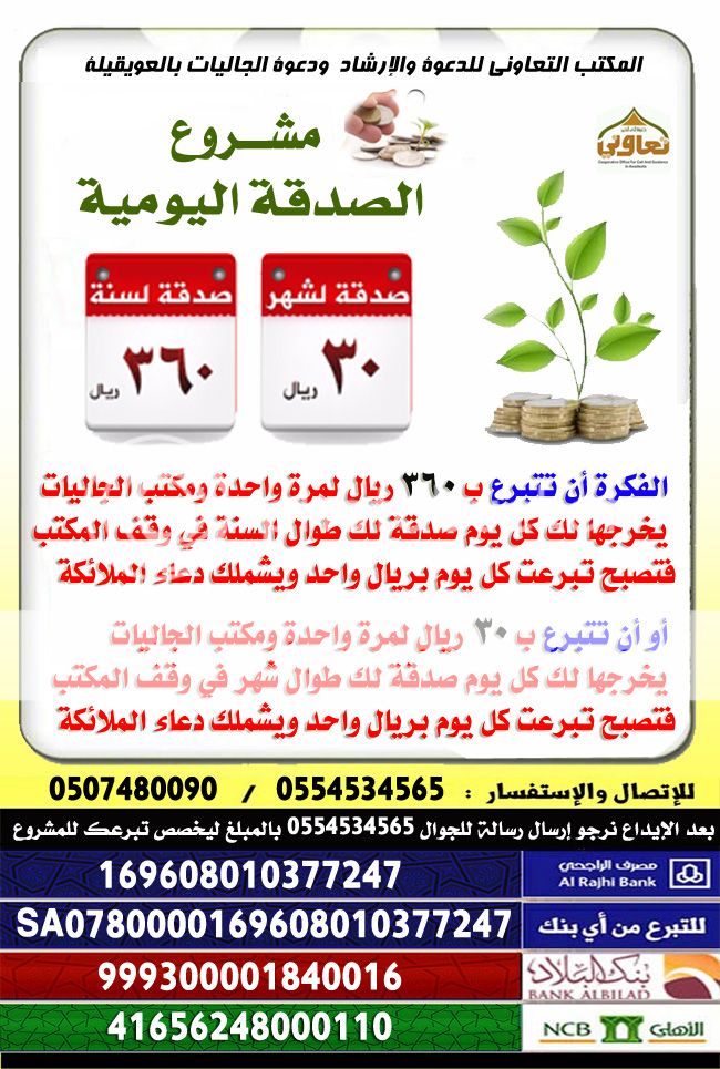 أو أن تتبرع ب 30 ريال لمرة واحدة ومكتب الجاليات يخرج عنك كل يوم ريال صدقة في وقف المكتب لمدة شهر كامل فتصبح تبرعت لشهر كامل كل يوم بريال واحد ولايفوت يوم الا وأنت متصدق ويشملك دعاء الملائكة
