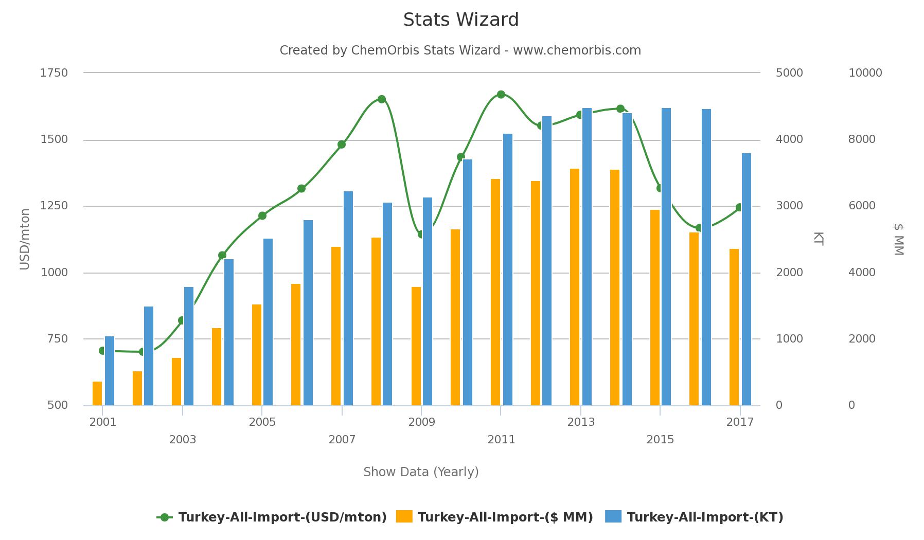 وفقًا لإحصائيات الاستيراد على موقع "كيم أوربس الإلكتروني، سجلت إجمالي واردات تركيا رقم قياسي جديدة خلال الثلاثة أرباع الأولى لعام 2017، حيث ارتفعت بمعدل 12% على أساس سنوي لتُقدر بنحو 3.8 مليون طن. ومع افتراض تراوح معدل الزيادة لواردات البوليمر بين 8-10% حتى نهاية العام، فمن المحتمل بنسبة كبيرة أن تتخطى إجمالي واردات البلاد من البوليمر الـ4.5 مليون طن أو تقترب من 5 مليون طن للعام بأكمله.