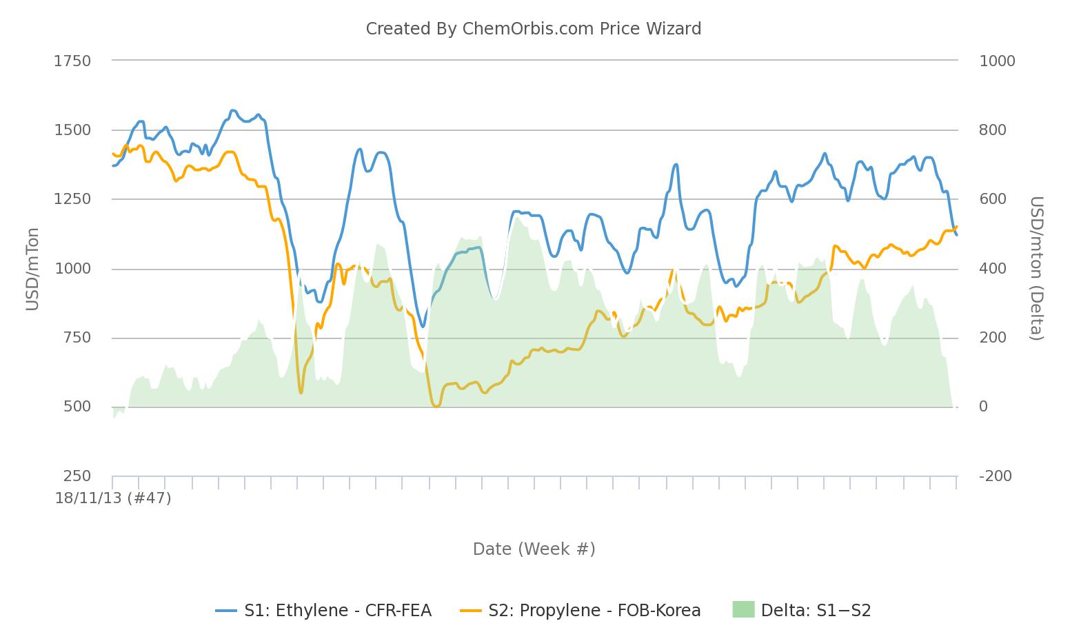 ووفقا لما أفادته البيانات الصادرة عن "أداة تحليل أسعار كيم أوربس"، اختتمت آخر تعاملات للإثيلين الفوري على أساس CFR الشرق الأقصى بأسعار تقل عن البروبلين في شهر نوفمبر لعام 2013.