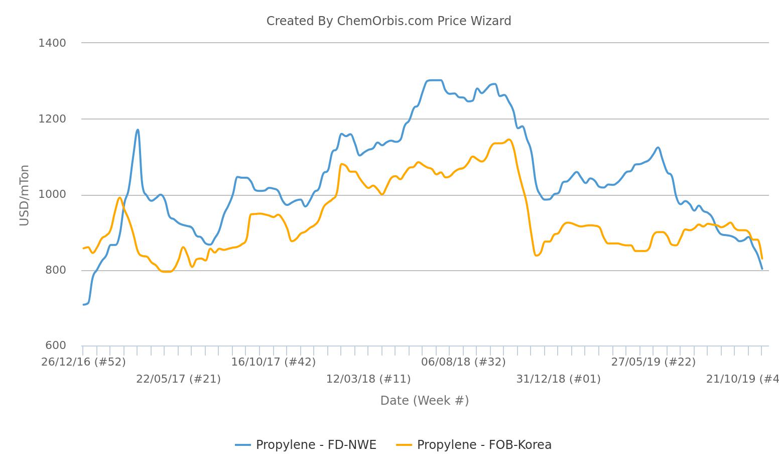 تراجع سوق البروبيلين في أوروبا بسبب عدم التوازن بين ارتفاع العرض وانخفاض الطلب من أسواق الخامات المشتقة ، حيث انتهت الأسعار في الأسبوع الماضي بانخفاض نسبتة 30 ٪ من الذروة الأخيرة في يونيو. يظهر متوسط البيانات الأسبوعية التي تم الحصول عليها من أداة تحليل أسعار كيم أوربس أن الأسعار على أساس FD شمال غرب أوروبا انخفضت مؤخرًا إلى أدنى مستوياتها منذ يناير 2017.