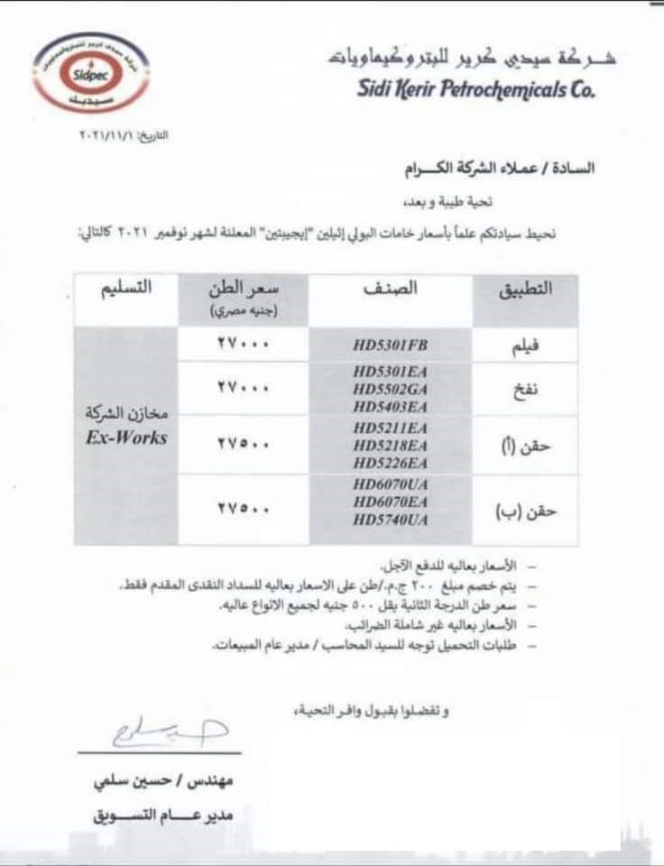 اسعار شركة سيدي كرير شهر نوفمبر 2021