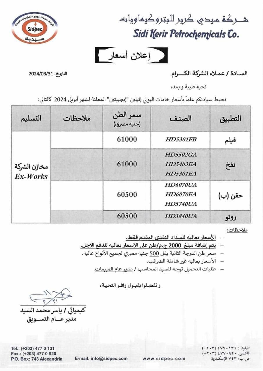 اسعار شركة سيدي كرير شهر ابريل 2024
