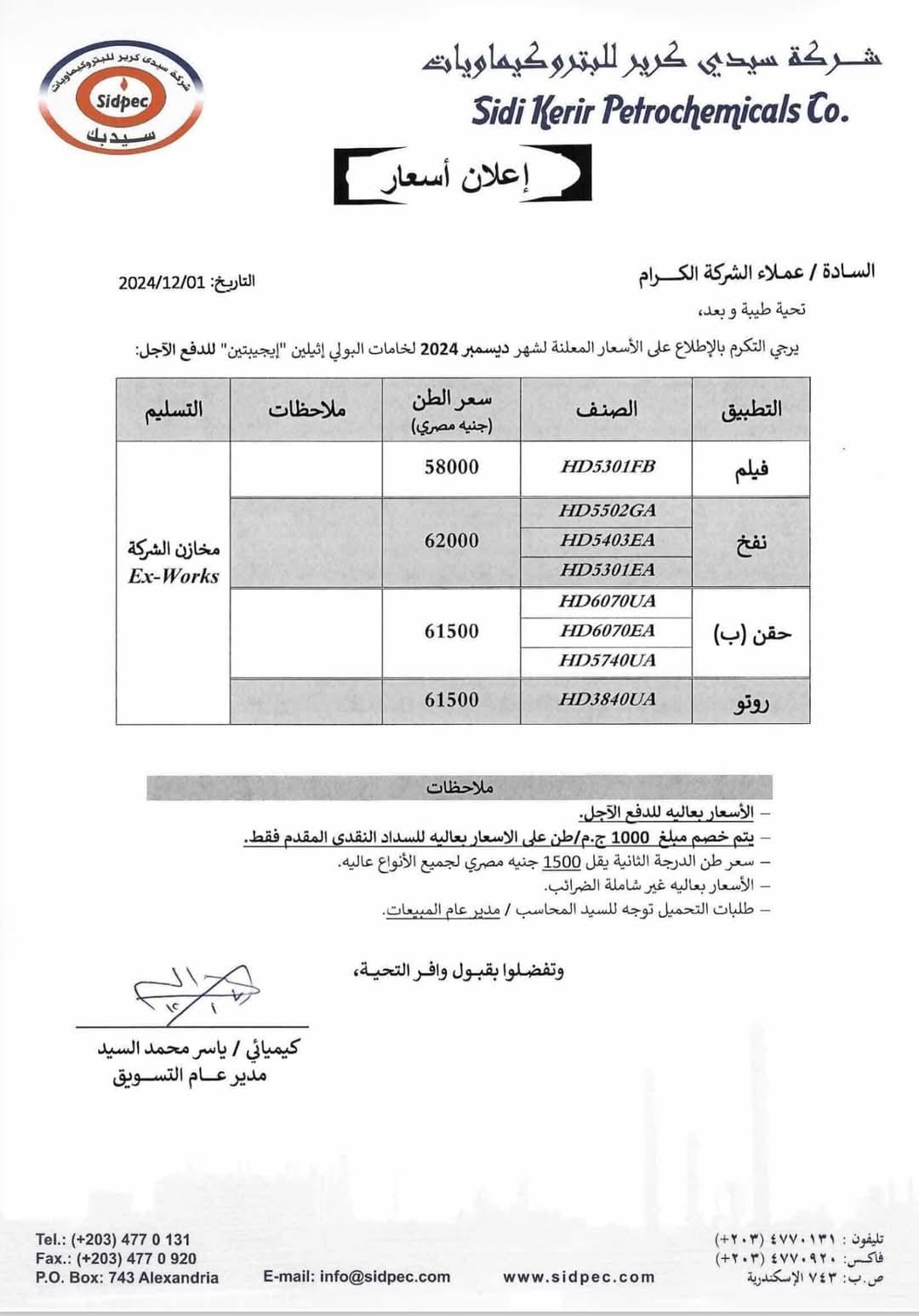 اسعار شركة سيدي كرير شهر ديسمبر 2024