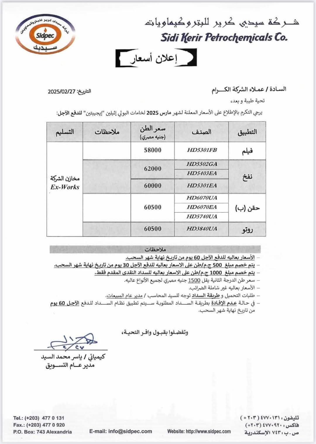 اسعار شركة سيدي كرير شهر مـــــــارس 2025