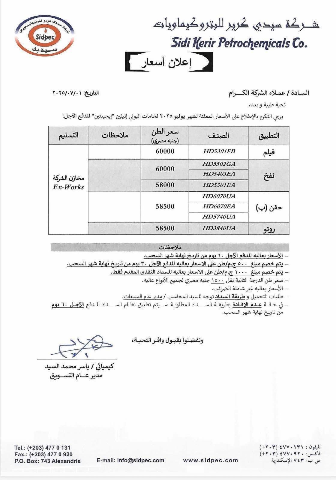 اسعار شركة سيدي كرير شهر يوليو 2025