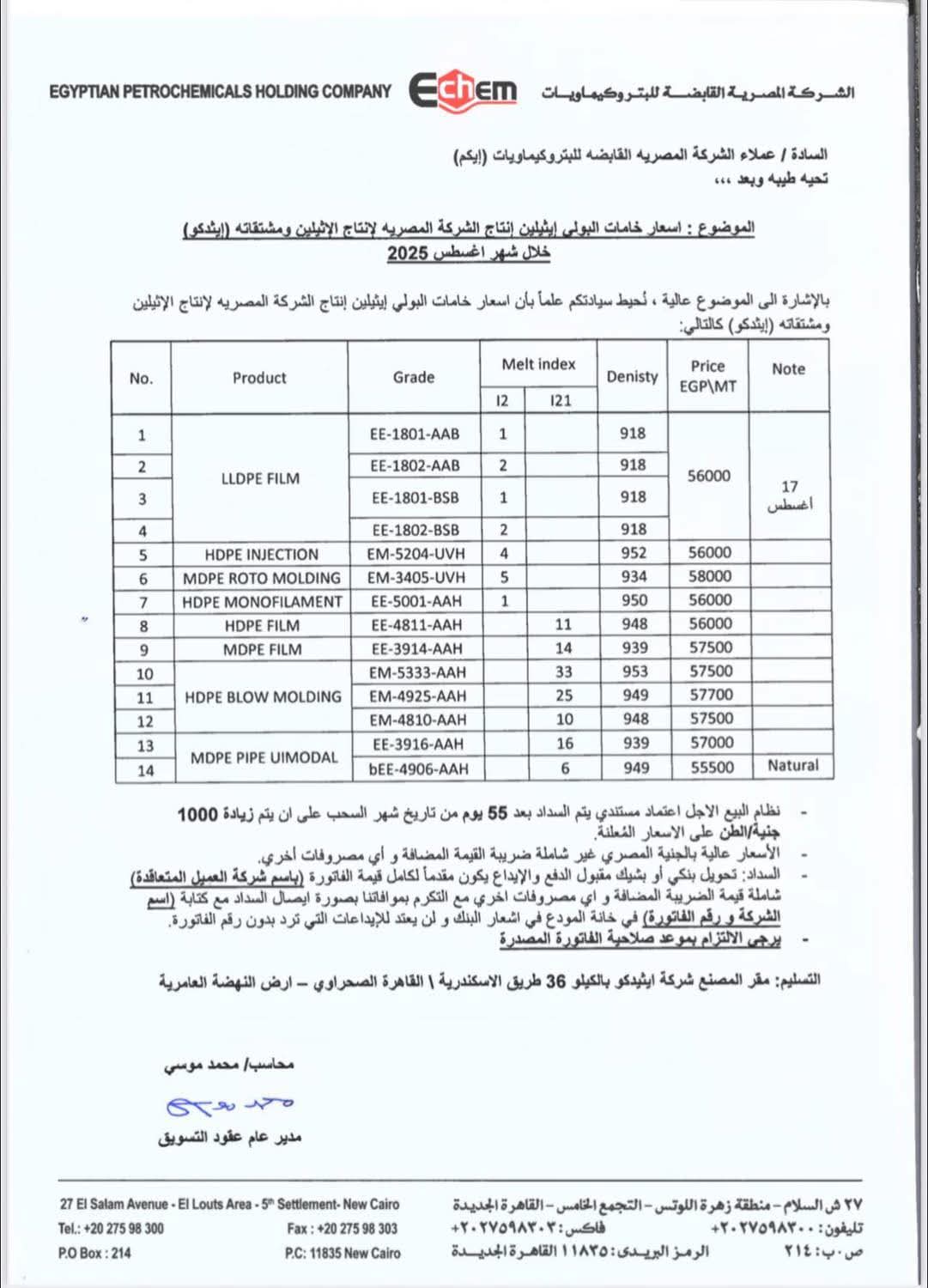 اسعار الشركة المصرية القابضه للبتروكيماويات اغسطس 2025