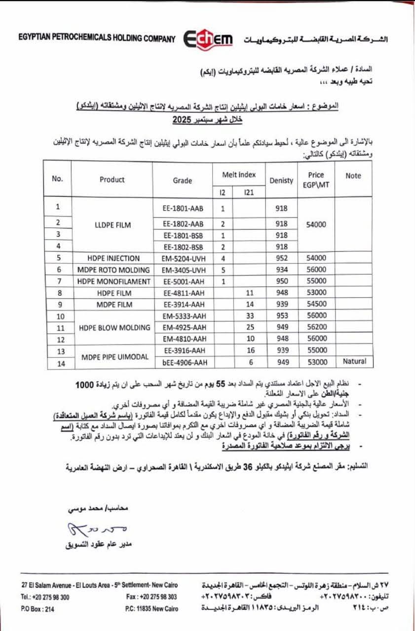 اسعار الشركة المصرية القابضه للبتروكيماويات سبتمبر 2025